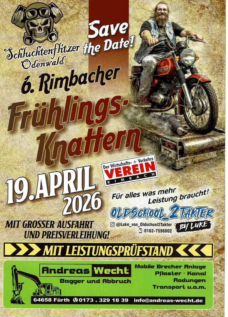 Am 27. April dröhnen in Rimbach wieder die Motoren! Beim 5. Rimbacher Frühlings-knattern treffen sich Zweitakt-Fans und Oldtimer-Liebhaber, um gemeinsam eien Runde zu